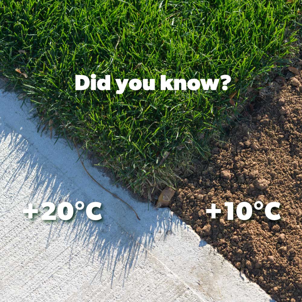 In fact, when temperatures soar, natural turf can be 10 degrees cooler than bare soil, 20 degrees cooler than asphalt, concrete, or pebbles and 40 degrees cooler than synthetic grass!